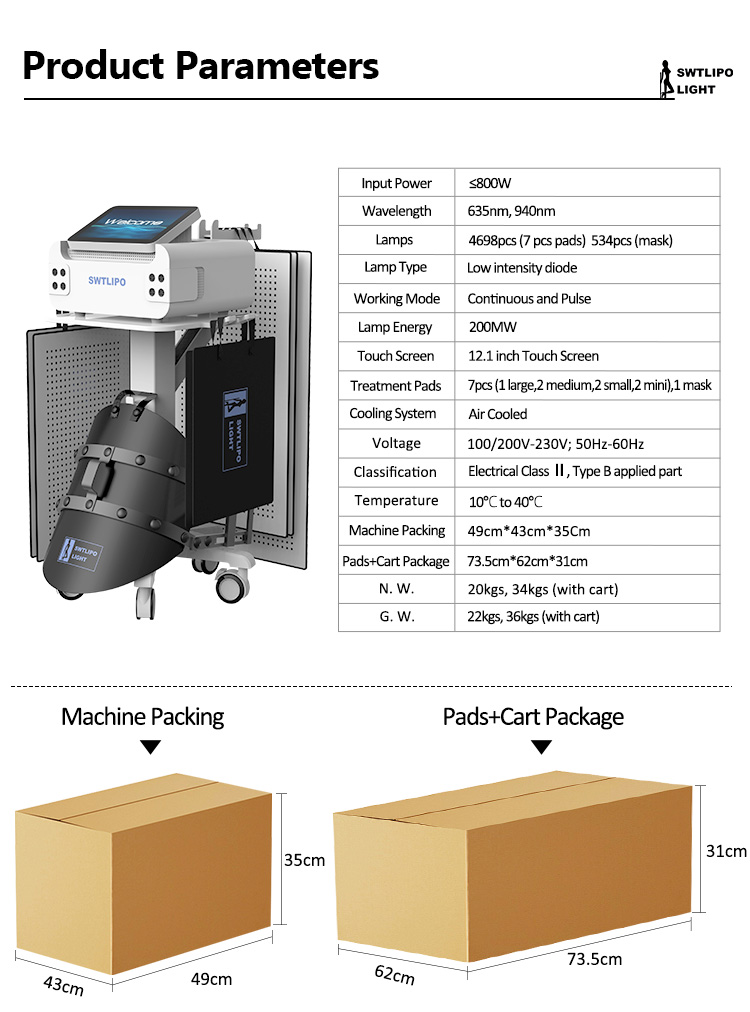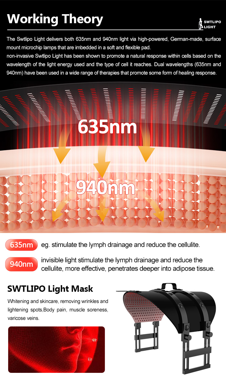SWTLIPOLIGHT--The Swtlipo Light delivers both 635nm and 940nm light via high-powered, German-made, surfacemount microchip lamps that are imbedded in a soft and flexible pad.non-invasive Swtlipo Light has been shown to promote a natural response within cells based on thewavelength of the light energy used and the type of cell it reaches. Dual wavelengths (635nm and940nm) have been used in a wide range of therapies that promote some fom of healing response.