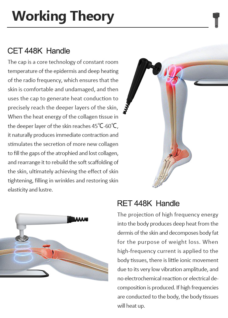 The cap is a core technology of constant roomtemperature of the epidermis and deep heatingof the radio frequency, which ensures that theskin is comfortable and undamaged, and thenuses the cap to generate heat conduction toprecisely reach the deeper layers of the skin,When the heat energy of the collagen tissue inthe deeper layer of the skin reaches 45°C-60°C,it naturally produces immediate contraction andstimulates the secretion of more new collagento fill the gaps of the atrophied and lost collagen,and rearrange it to rebuild the soft scaffolding ofthe skin, ultimately achieving the effect of skintightening, filling in wrinkles and restoring skin