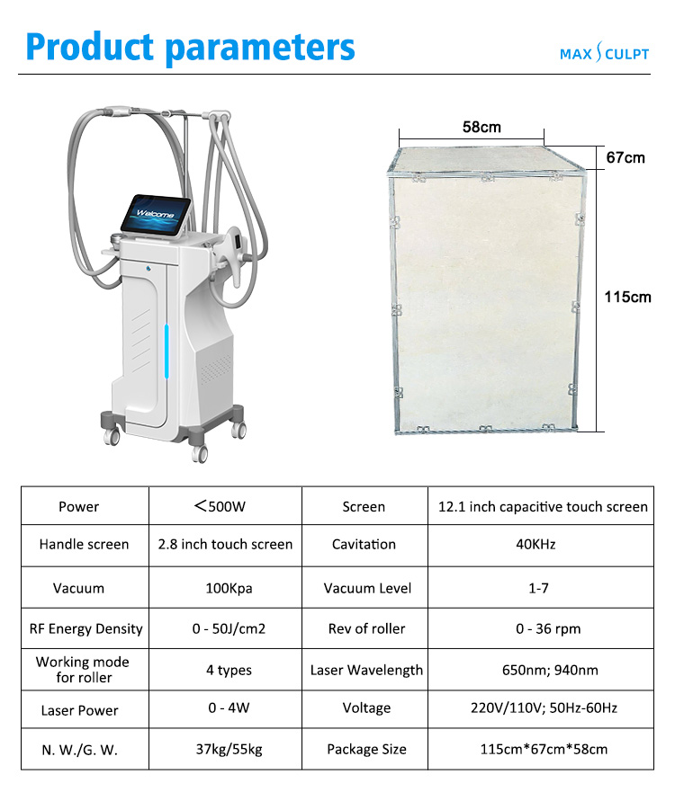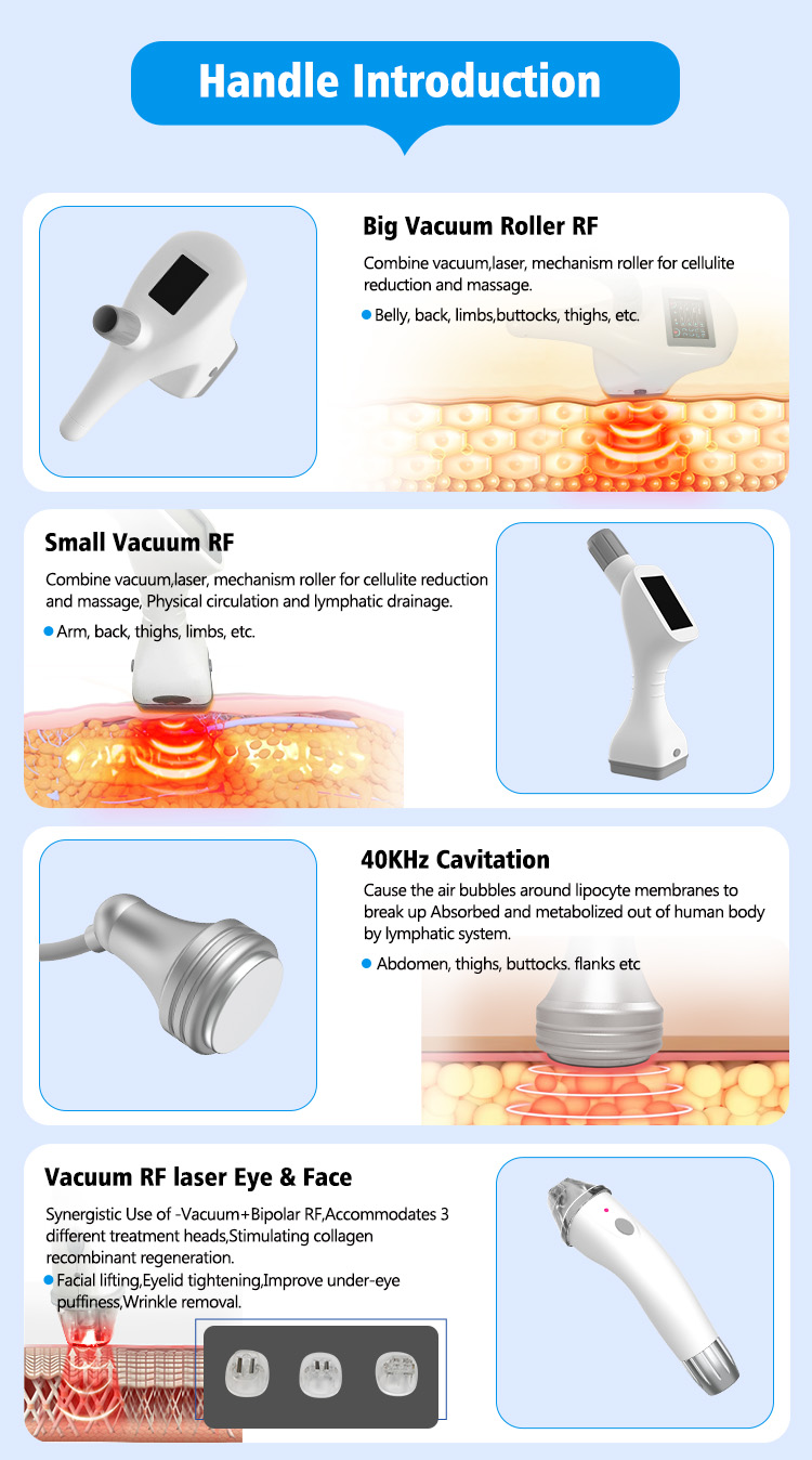 The Vacuum series is a vacuum negative pressure, bipolar RF, infrared laser, skin folding,mechanical rolling technology instrument, suitable for all parts of the body of fat -dissolv-ing,shaping the body, firming the skin, and physiotherapy equipment.It can effectively degrade the subcutaneous fat cells into carbon dioxide and water,and atthe same time promote the metabolism of the human body, greatly improving the effectof lipolysis, shaping and physiotherapy.