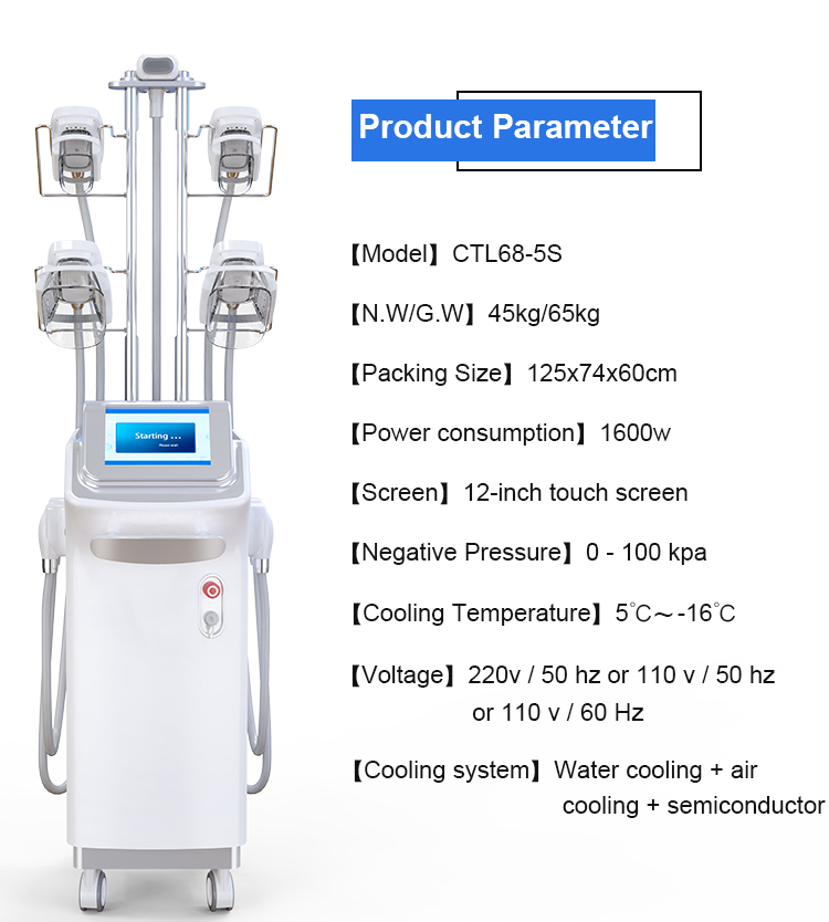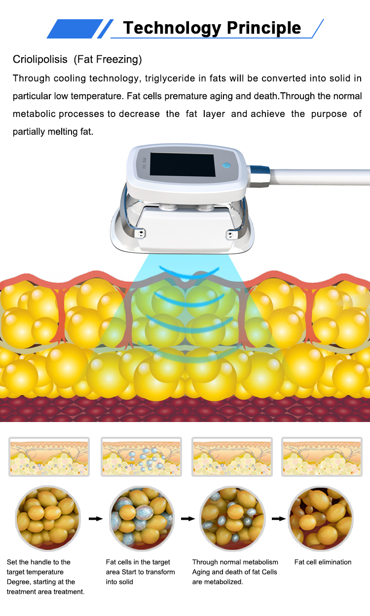 Through cooling technology, triglyceride in fats will be converted into solid inparticular low temperature. Fat cells premature aging and death. Through the normalmetabolic processes to decrease the fat layer and achieve the purpose ofpartially melting fat.