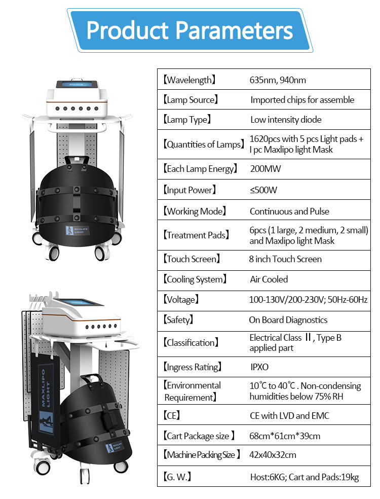 · The Maxlipo Light delivers both 635nm and 940nm light via high-powered, Ger-man-made, surface mount microchip LEDs that are imbedded in a soft and flexibleoad. The pads can be easily applied to any area of the body. Because of the Maxli-po Light's proprietary reflective coating, the light that would normally bounce off theskin is reflected back, resulting in a much higher retention of light energy than withother similar devices. No other system has this reflective coating. A Maxlipo Lightsession is pain-free, with no heat or discomfort, and is safe to operate for both theoatient and the technician.