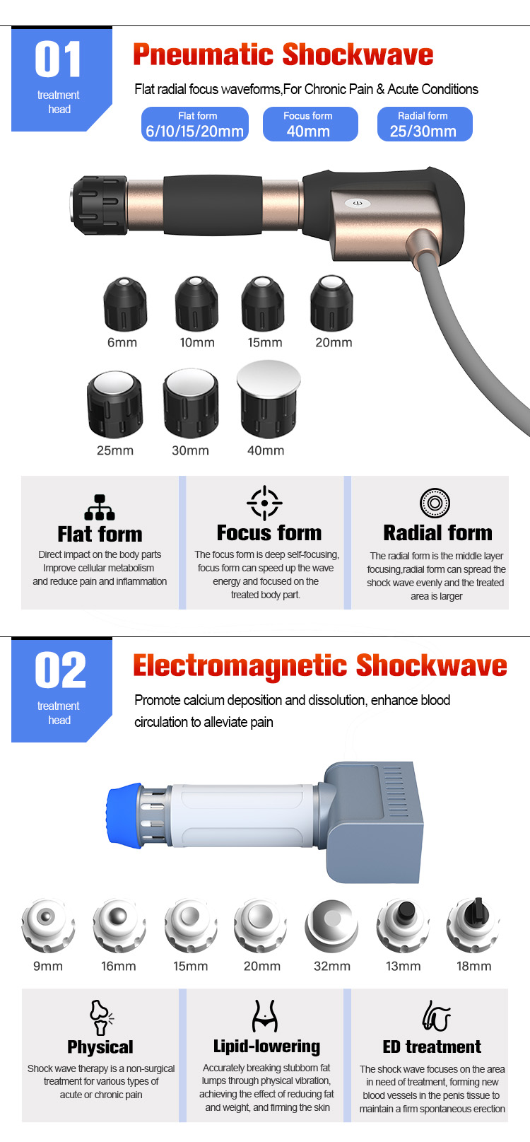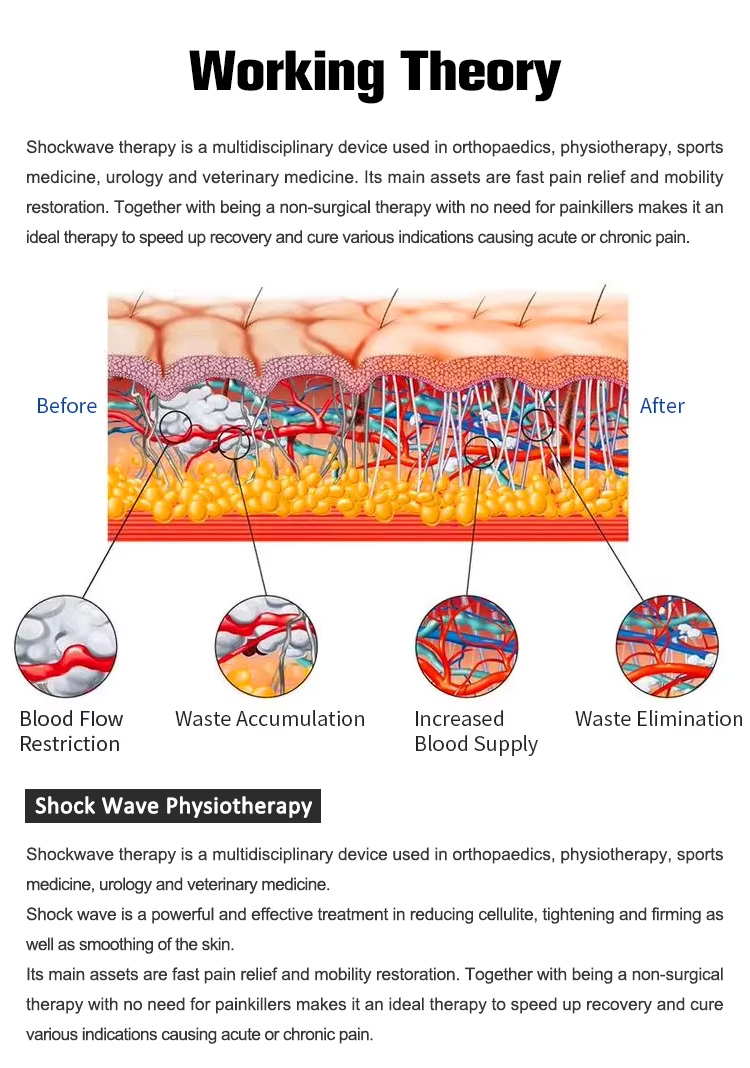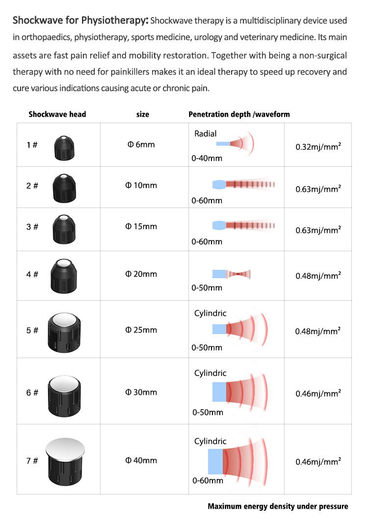 Shockwave therapy is a multidisciplinary device used in orthopaedics, physiotherapy, sportsmedicine, urology and veterinary medicine. Its main assets are fast pain relief and mobilityrestoration. Together with being a non-surgical therapy with no need for painkillers makes it anideal therapy to speed up recovery and cure various indications causing acute or chronic pain.